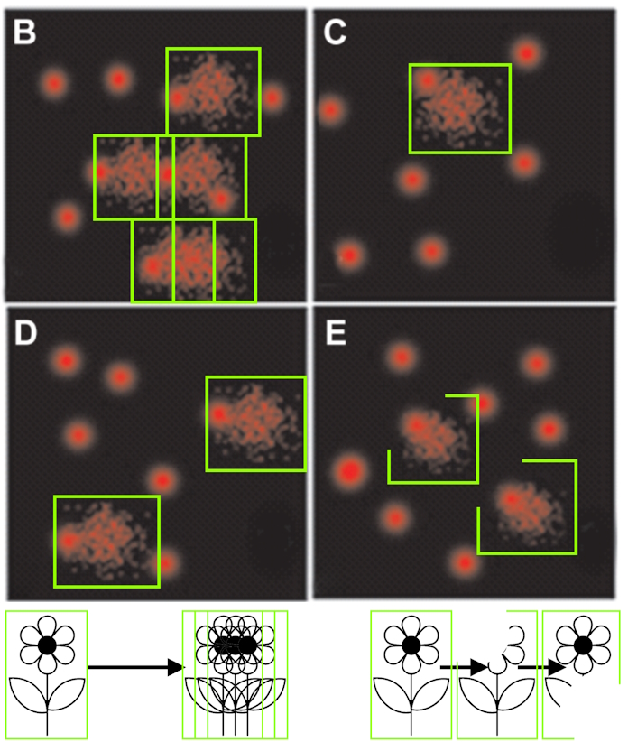 A few points to consider about the image above. The background is deep black with no spots of noise. Some of the cells are aligned with the border of the image in rows and columns. The cells seem to avoid each other, and they also avoid the edges of the rectangle. None of the cells are bisected by the border of the image. Finally, some of the comet trails have duplicated areas.