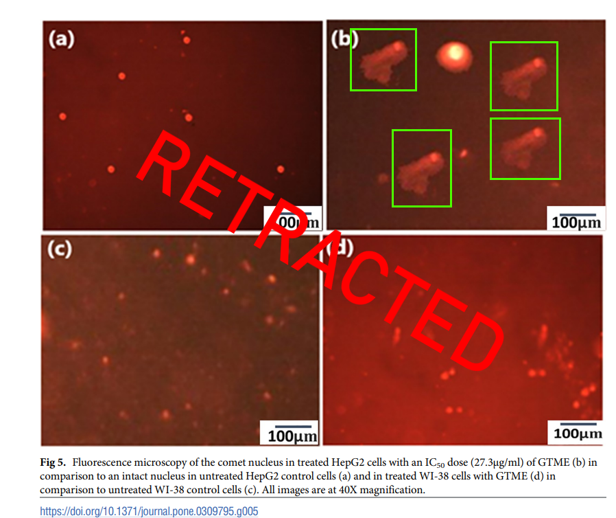 During this search, I also found a large number of comet assays images that started out with something authentic, and then manipulated it by cloning parts of the image. Here is an example from 2024 in a journal that will likely be familiar to readers. These “falsified” comet assays are not included in my list, which is focused only on entirely fabricated examples.