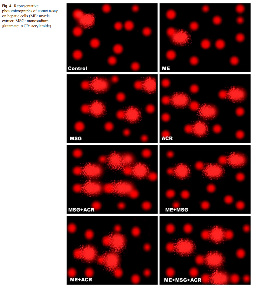 Hanaa A. Hassan, Wafaa M. EL-Kholy, Mamdouh R. F. EL-Sawi, Nadine A. Galal, Mohamed Fawzy Ramadan Myrtle (Myrtus communis) leaf extract suppresses hepatotoxicity induced by monosodium glutamate and acrylamide through obstructing apoptosis, DNA fragmentation, and cell cycle arrest Environmental science and pollution research international (2020) doi: 10.1007/s11356-020-08780-7