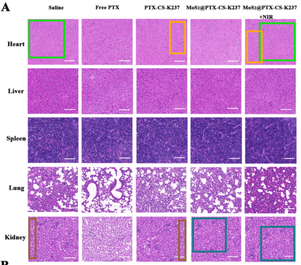 “Heart/ Saline” and “Heart / MoS2@PTX-CS-K237 + NIR” appear to be identical but are described as representing different experimental samples.