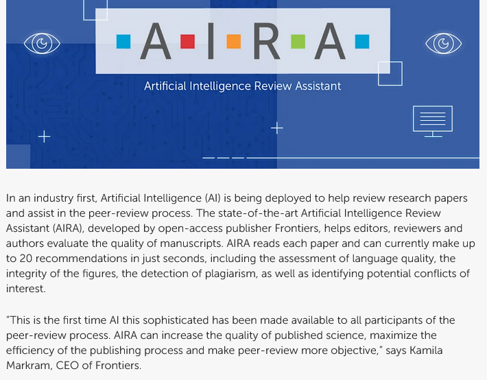 “AIRA reads each paper and can currently make up to 20 recommendations in just seconds, including the assessment of language quality, the integrity of the figures, the detection of plagiarism, as well as identifying potential conflicts of interest.”