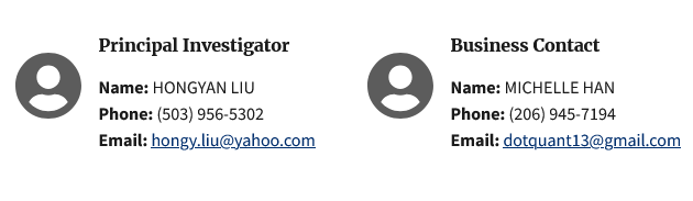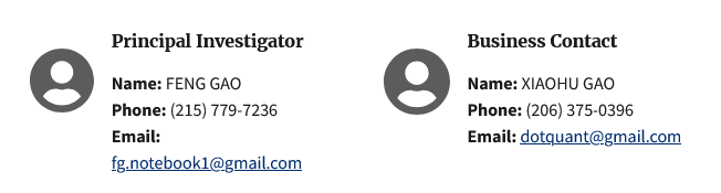 Now, to the biologics company Dotquant, which specialises in RNA therapeutics. It was founded in 2013 and is located in Seattle, Washington, USA. The company’s listed managers are Feng Gao, Xiaohu Gao (associate professor at University of Washington) and Hong Yan Liu, the latter acts as CSO but is also assistant professor at the Medical College of Georgia at Augusta University. Liu also used to be the PhD student of X Gao.