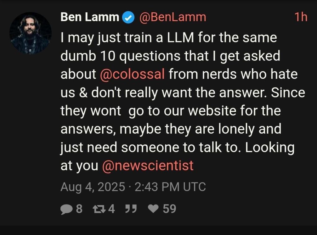 Rawlence was subject to two “anonymous hit pieces” on Space Coast Daily and a website by Inter Press Service news agency. The anonymously-written articles about Lynch were published on Green Matters, APN News and TheDaily Blaze. Colossal’s CEO Ben Lamm denied his company’s involvement in a message to New Scientist. However, Lamm confirmed that Colossal’s lawyers indeed threatened Lynch with a cease-and desist letter over his “increasingly hostile and now defamatory attacks” on X.