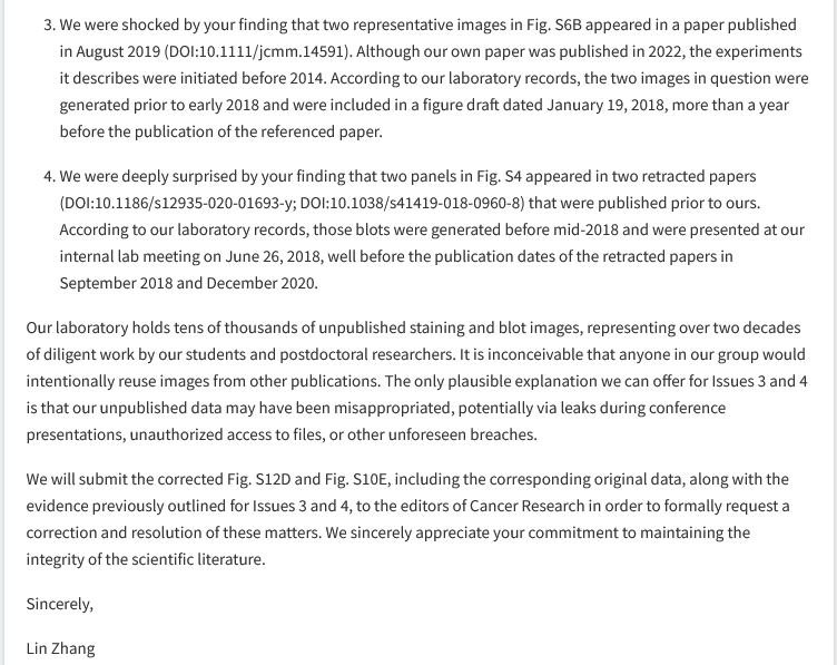 “3. We were shocked by your finding that two representative images in Fig. S6B appeared in a paper published in August 2019 (DOI:10.1111/jcmm.14591). Although our own paper was published in 2022, the experiments it describes were initiated before 2014. […]
