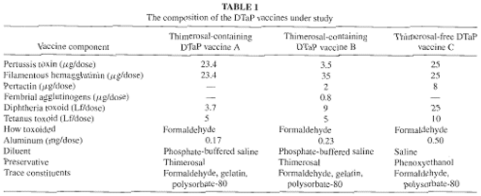 “We calculated the cumulative exposure to ethylmercury from individual automated vaccination records, assuming each vaccine to contain the mean dose reported by manufacturers to the FDA. We assessed this cumulative exposure at the end of the first, second, third and sixth months of life. The Thimerosal content of childhood vaccines used in the two HMOs is as follows: