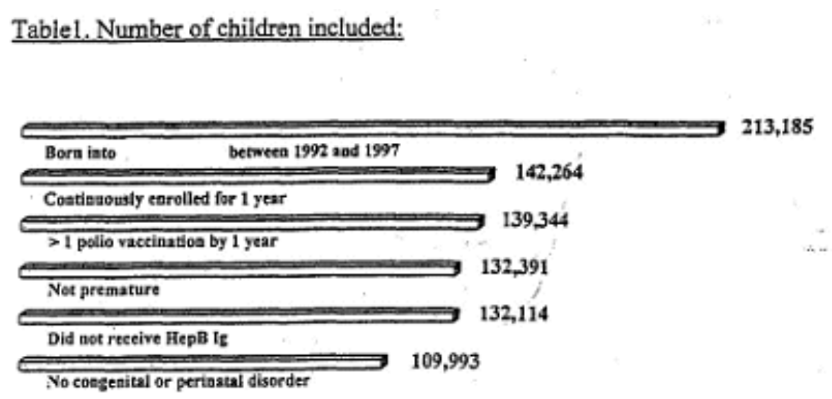 To ensure capture of all vaccination in the first year of life within the HMO, we restricted the cohort to children that were born into the HMO, continuously enrolled for the first year of life and that received at least 2 polio vaccines within the HMO y the age of 1 year. We excluded infants with ICD9 codes indicative of congenital disorders, severe perinatal disorders, recipients of HepB immunoglobulins, and gestational age less than 38 completed weeks. For this last group we performed separate analyses.”