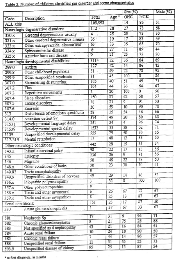 “Table 2 shows the number of cases encountered for each disorder, the mean age at first diagnosis, the distribution over the two HMOs and the percentage males among cases.