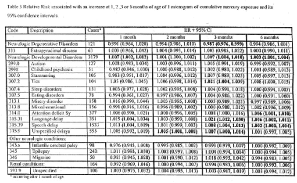 “Results for risk estimates are given first for the cumulative mercury exposure as a continuous variable assessed at 1, 2, 3, and 6 months of age. Table 3 shows the number of cases occurring any time after the point at which the exposure is assessed, the relative risk estimate, and its 95% confidence intervals, associated with an increase of 1 microgram of cumulative mercury exposure at 1, 2, 3, or 6 months of age… [S]tatistically significant results (not adjusting for multiple comparisons) are bolded.