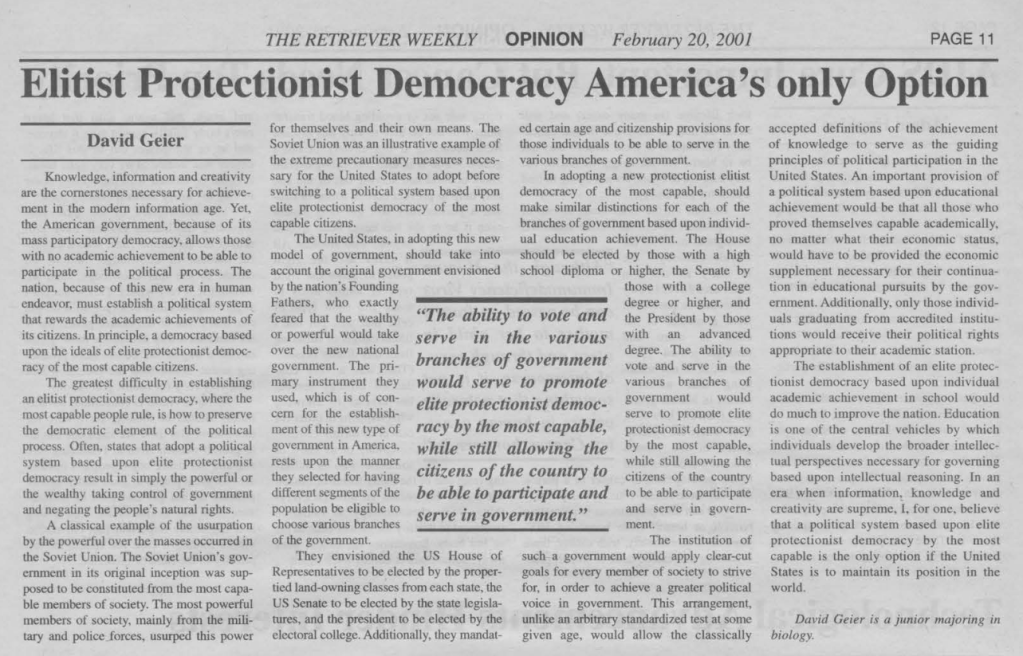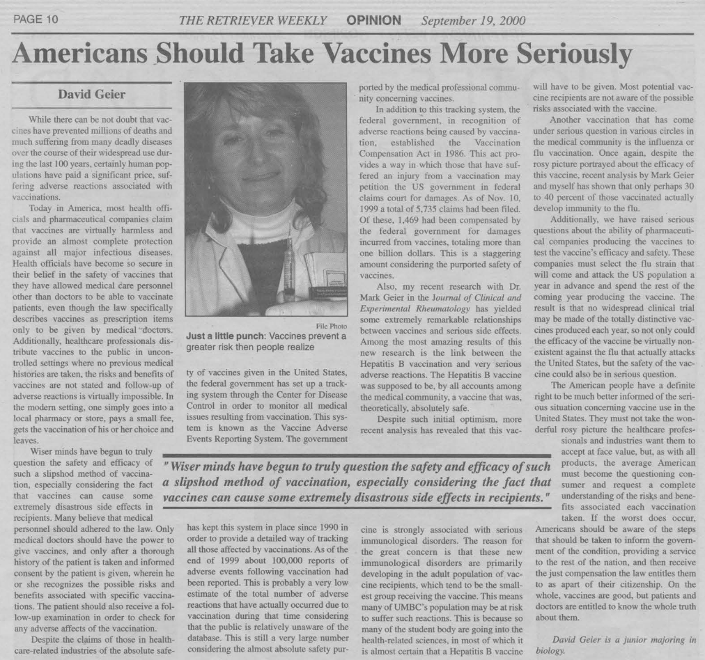 David Geier, “Elitist Protectionist Democracy America’s only Option” UMBC (2001)David Geier, “Americans _Should Take Vaccines More Seriously” UMBC (2000)