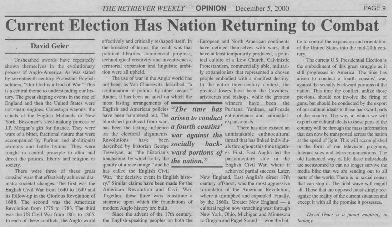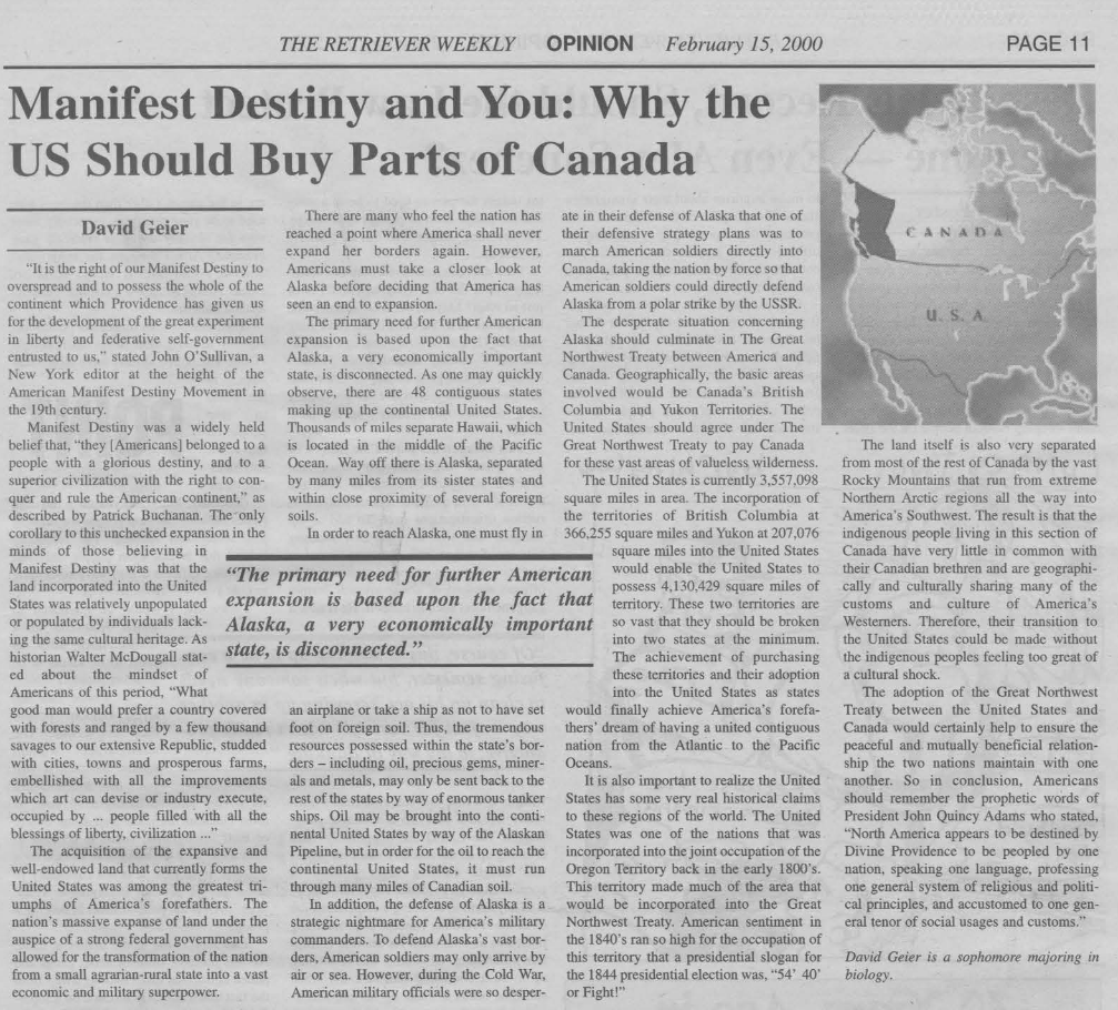 David Geier, “Manifest Destiny arid You: Why the US Should Buy Parts of Canada” UMBC (2000)David Geier, “Current Election Has Nation Returning to Combat”, UMBC (2000)