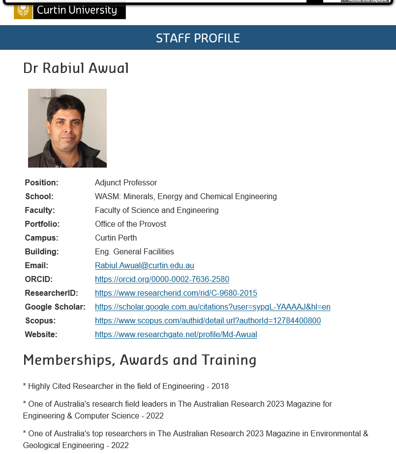 The papermiller and shameless citation extortionist Md Rabiul Awual was apparently kicked out from Curtin University in Australia following the notifications by Fabian Wittmers and yours truly. Awual used to be portrayed by his employer as “One of Australia’s top researchers“ and “One of Australia’s research field leaders“, read June 2025 Shorts and here: