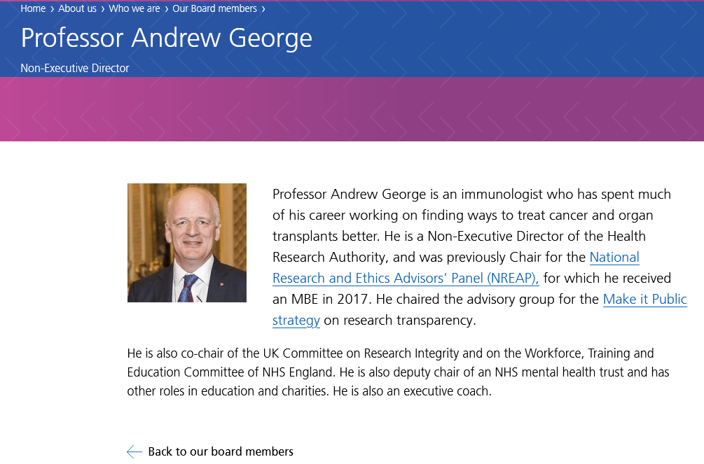 Do you remember Andrew George, Co-Chair of the UK Committee on Research Integrity (UKCORI)? He is also Non-Executive Director of the Health Research Authority (HRA) and emeritus professor of immunology at Imperial College London, and author of several research papers with manipulated data.