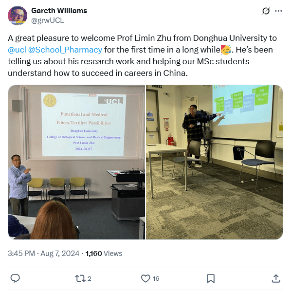 “A great pleasure to welcome Prof Limin Zhu from Donghua University to @ucl @School_Pharmacy for the first time in a long while. He’s been telling us about his research work and helping our MSc students understand how to succeed in careers in China.” (Williams on X, 2024)