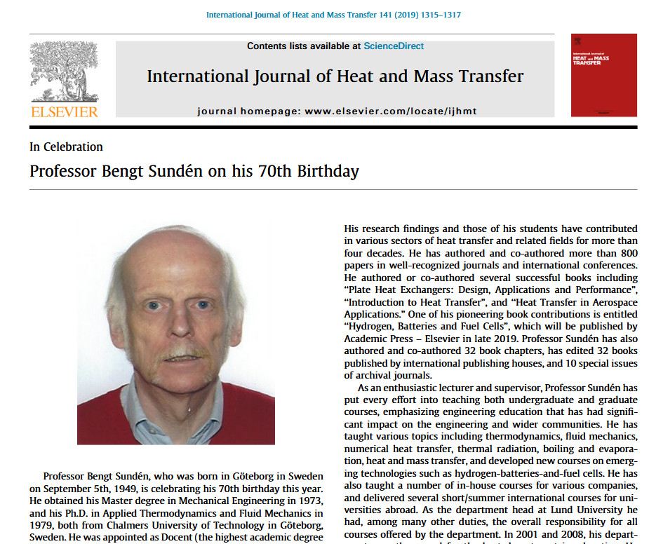 Meet Bengt Sundén, emeritus professor and former department head at the Lund University in Sweden. In 2019, Elsevier’s International Journal of Heat and Mass Transfer published a Festschrift by his former mentees, titled: “Professor Bengt Sundén on his 70th Birthday“: