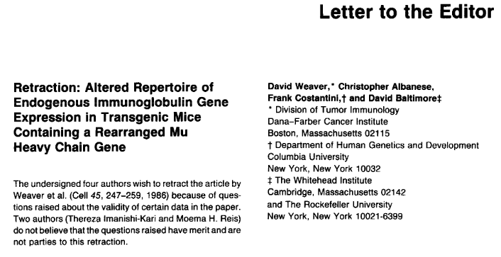 “‘The undersigned four authors wish to retract the article by Weaver et al. (Call 45, 247-259, 1986) because of questions raised about the validity of certain data in the paper. Two authors (Thereza Imanishi-Kari and Moema H. Reis) do not believe that the questions raised have merit and are not parties to this retraction.”