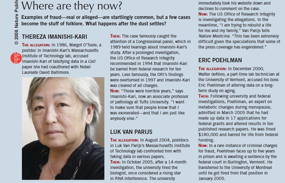 , in 2005 Nature reminded that Imanishi-Kariwas indeed an innocent victim of slander, and it seems Baltimore tried the same for van Parijs .