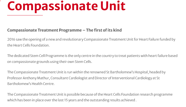 That is not exactly correct. Mathur owns the company Heart Cells, and is trustee of a similarly named “charity” Heart Cell Foundation, which was set up in 2003 by a wealthy British patient whom Mathur treated with bone marrow cell injections at the University of Frankfurt in Germany (the patient died in 2006). The Foundation offers “compassionate” stem cell therapies for cardiovascular disorders, using autologous bone marrow, see for example this news reporting from September 2025: