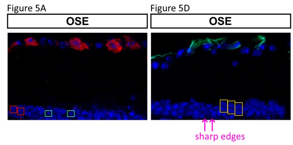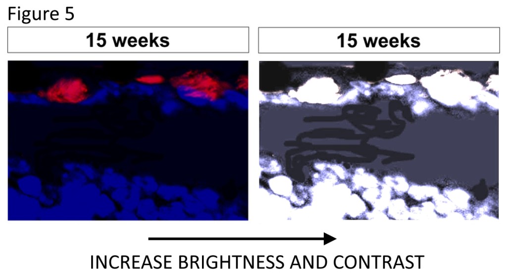 In Figure 6E you can see unnaturally dark background scribbles, cloned individual elements, and a large section of recycled DAPI staining where one of the images has been substantially modified with painting to make them appear different. Again, In this image I have increased the brightness and contrast to help visualise these elements. If you’re still struggling to see the scribbling hopefully the image from Figure 5 should be completely convincing:
