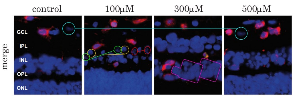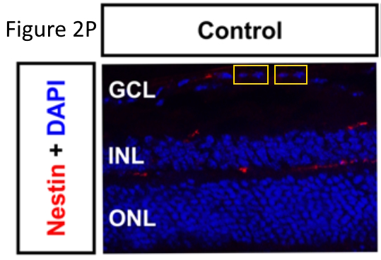 The light microscopy images of stained eyes have been enlarged by mirroring or duplicating large blocks through the centre of the image. These mirrored sections have a few differences too, so they must have also been doctored. The same paper includes too many edited images to show all of them, but here are some more scribbles and cloned areas of DAPI staining: