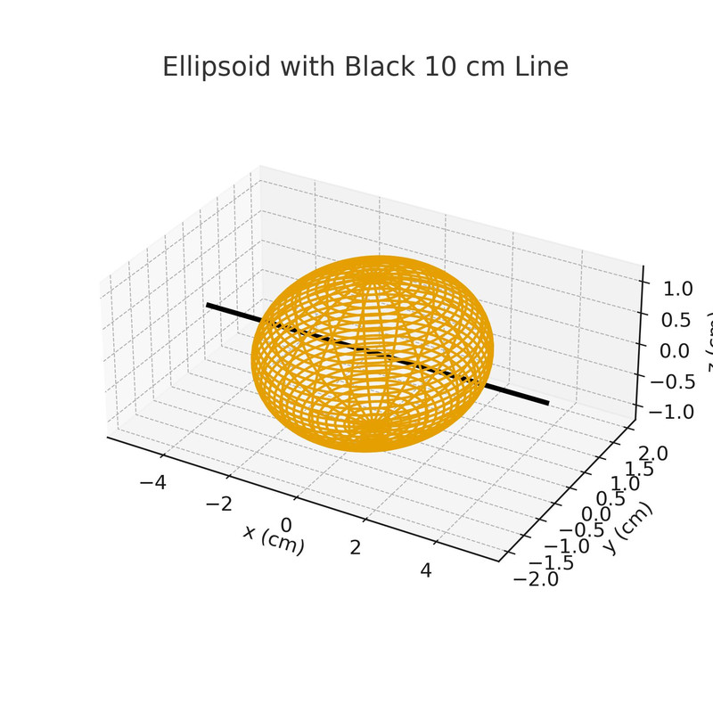 The black line is 10 cm in length (representing the length of the average lab mouse), and the orange ellipsoid is 30 cm3 in volume.