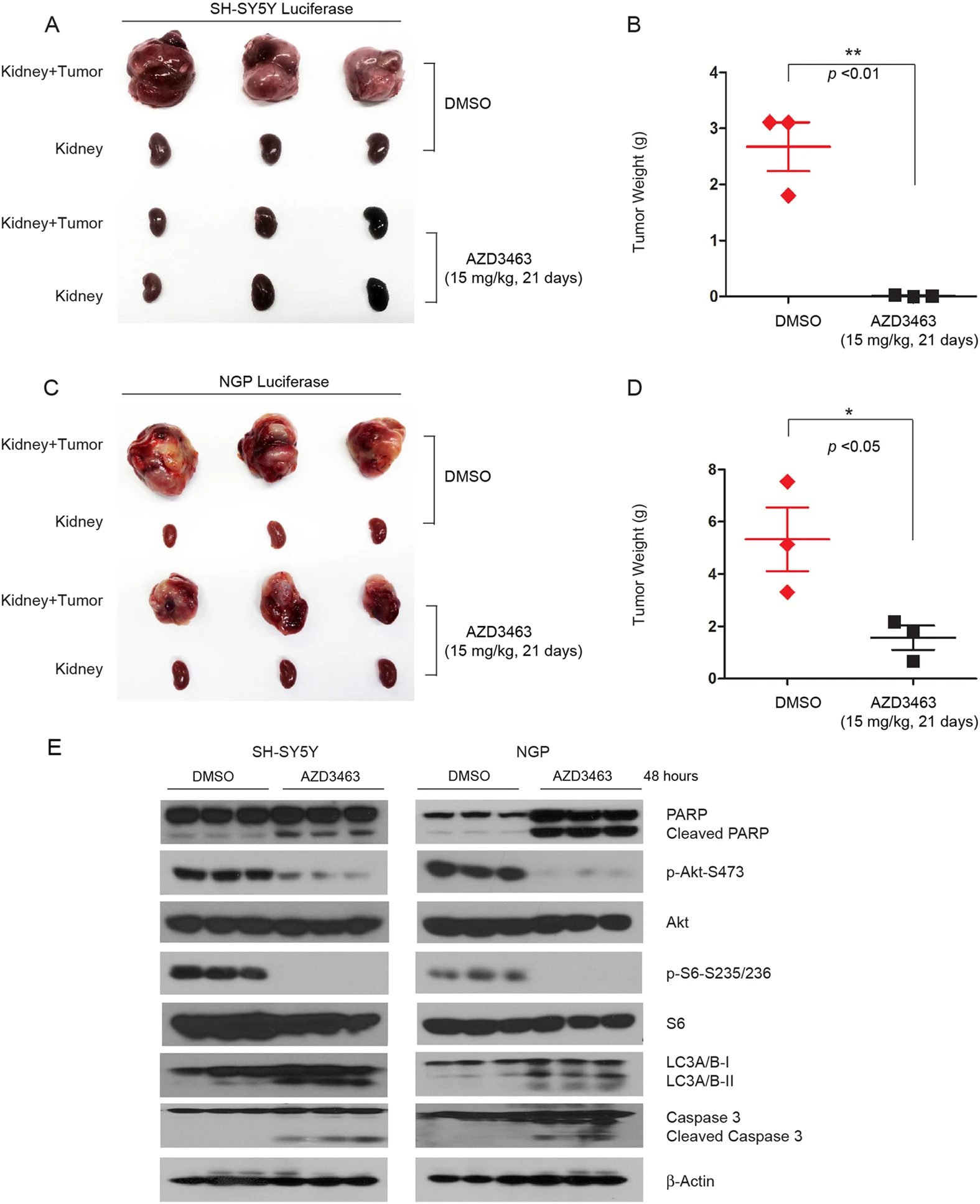 Figure 5D shows that the tumour weight of mice in the NGP Luciferase DMSO (control) group reached >5g at end of study, with the largest measurement at ~7.5g. This is greater than what most animal ethics committees would consider a humane endpoint (for example, NIH OACU recommends humane endpoints when tumour burden greater than 10% of body weight), unless you had mice with a body weight >52g.