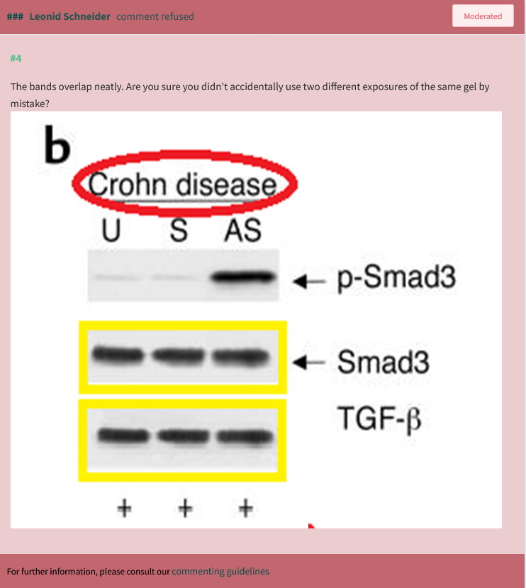 Monteleone again spoke of “non-specific dots” that are “proving the authenticity of these data“, and that western blots “tend to look usually very similar but this does not imply that these blots have been subject to any falsification.” Well, as an old gastroenterology joke goes – opinions are like a**holes, everyone’s got one.