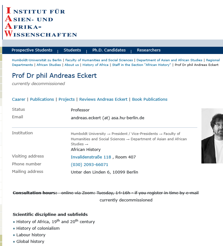 An August 2023 statement by the Student Committee at FU Berlin names the alleged harasser: Andreas Eckert, professor for history of Africa and colonialism at IAAW institute at Humboldt University (HU) Berlin. Presently, the university lists Eckert as “currently decommissioned“: