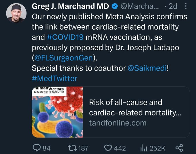 The study claimed to have uncovered that “COVID-19 vaccination may be associated with a small increase in cardiac-related mortality, especially among males“. It was immediately debunked by several experts on Twitter, as referenced on PubPeer. In October 2023, Borja Somovilla Del Saz managed to publish a rebuttal to Marchand et al 2020 in the same journal, to which Marchand and Masoud published their own rebuttal, to which Somovilla Del Saz replied again. titled: “Reconsidering the inclusion of Ladapo’s work in the meta-analysis: Validity concerns and implications“. Joseph Ladapo, on whose work Marchand et al based their analysis, earned himself in September 2021 the office of Surgeon General of Florida due to his unhinged and frankly homicidal views on COVID-19 restrictions, masks and vaccines (he even compared vaccine mandates to slavery). and suggested to use hydroxychloroquine and ivermectin instead.