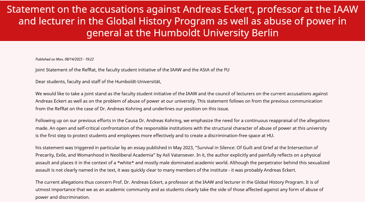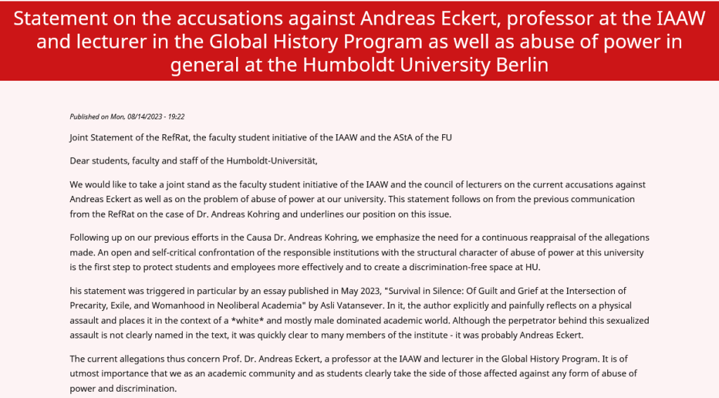 “We would like to take a joint stand as the faculty student initiative of the IAAW and the council of lecturers on the current accusations against Andreas Eckert as well as on the problem of abuse of power at our university. […] [T]his statement was triggered in particular by an essay published in May 2023, “Survival in Silence: Of Guilt and Grief at the Intersection of Precarity, Exile, and Womanhood in Neoliberal Academia” by Asli Vatansever. […]
