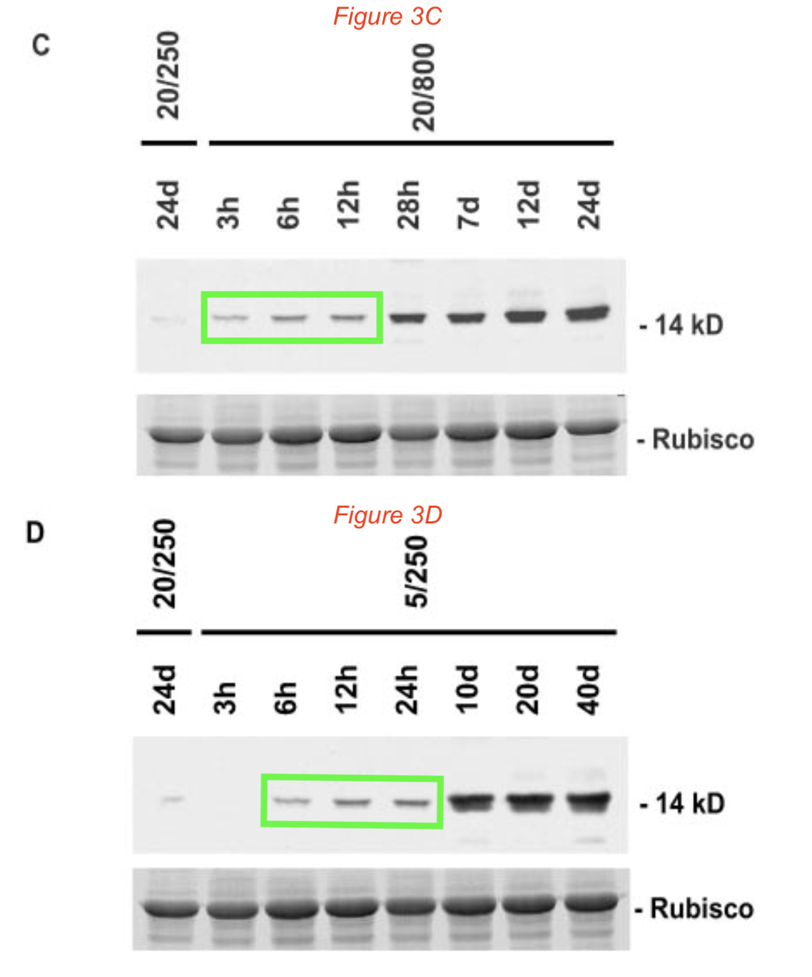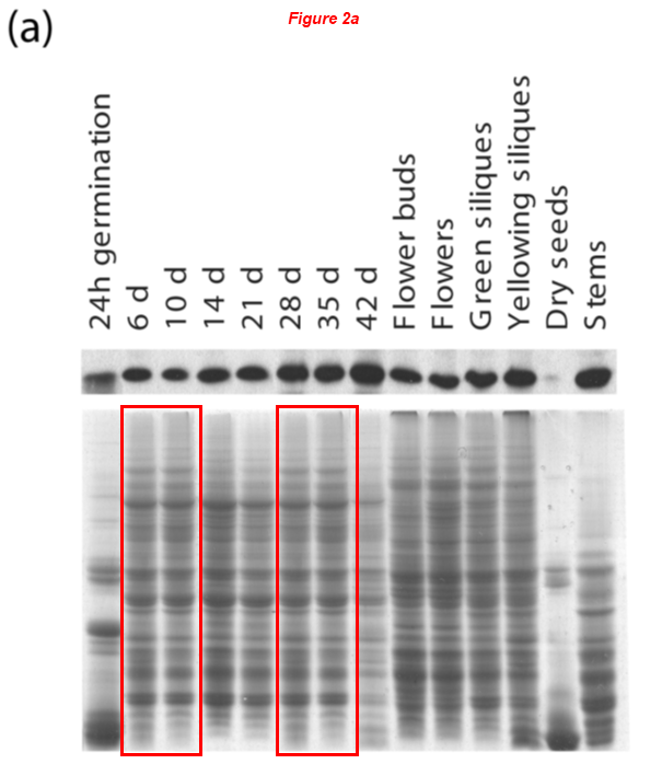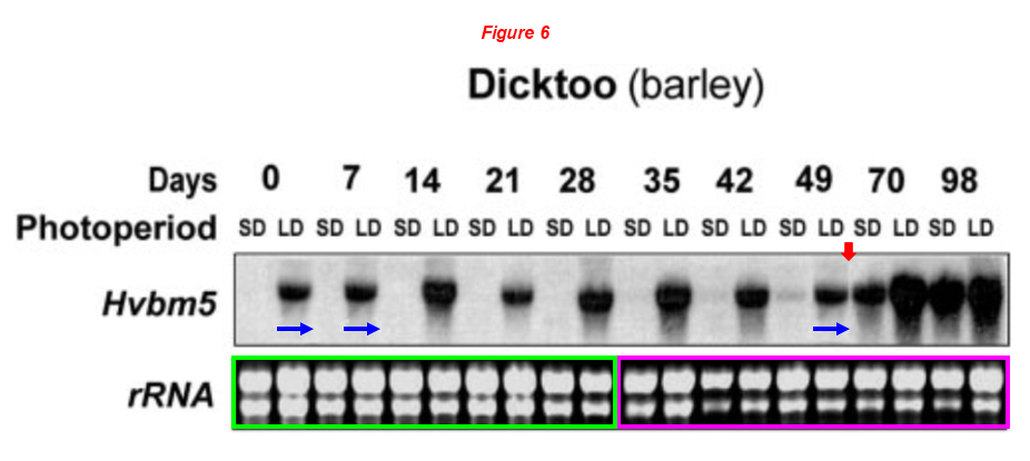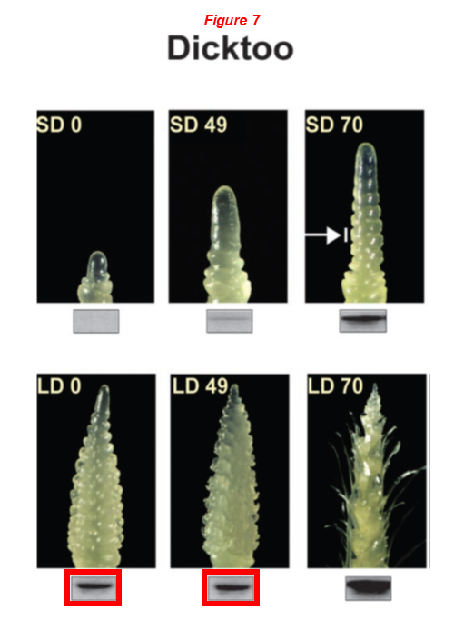 Moreover, several images also appear rescaled in Figures 6A of Diallo et al. 2010 […] where treatments and genotypes are different (controls WT and 35S::GUS, transgenic plants 35S::TaVRN-B2 Line1–Line3.”