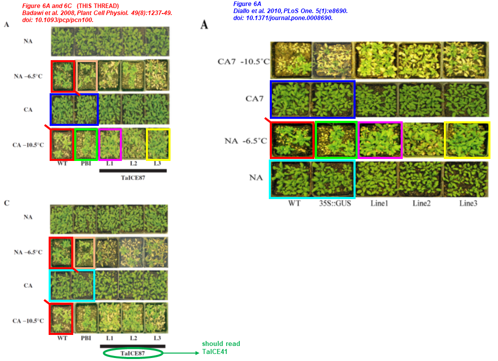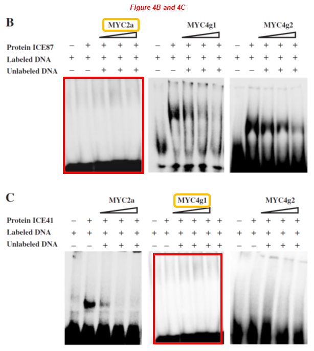 Badawi et al 2008: “Two gel mobility shift assays are identical (red boxes), but are supposed to show the binding affinity between TaICE87 and MYC2a (Figure 4B), or between TaICE41 and MYC4g1 (Figure 4C).”