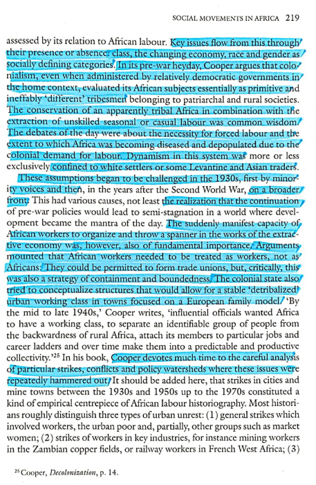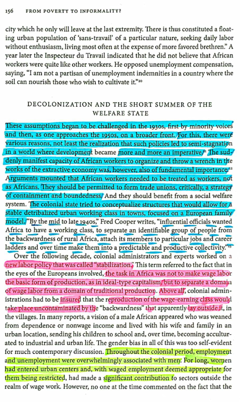 - Blue: Bill Freund “AFRICAN LABOUR HISTORY Decolonization and African Society: The Labor Question in French and British Africa. By Frederick Cooper. Cambridge: Cambridge University Press, 1996. Pp. xvii+677; £55 (ISBN 0-521-52651-1); £19.95, paperback (ISBN 0-521-56600-2).” The Journal of African History (1997), DOI: https://doi.org/10.1017/S0021853797357077