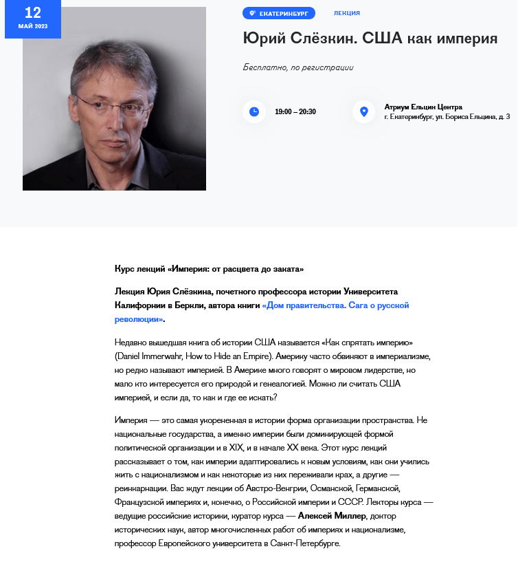 Here is an announcement by the Yeltsin Center of a lecture which Slezkine gave in Yekaterinburg, russia, on 12 May 2023. The topic was US-American imperialism: