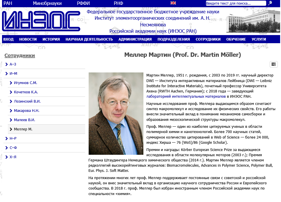 Oh, and there is another German professor involved, as Mendeleev Prize Jury member in 2023 and now in 2026: Martin Möller, professor at RWTH Aachen University. In 2018, his DWI Leibniz Institute proudly announced that Möller was “elected foreign member of the Russian Academy of Sciences“, on the occasion of his research at Nesmeyanov Institute in Moscow being sponsored by a “Mega Grant of the Government of the Russian Federation“.