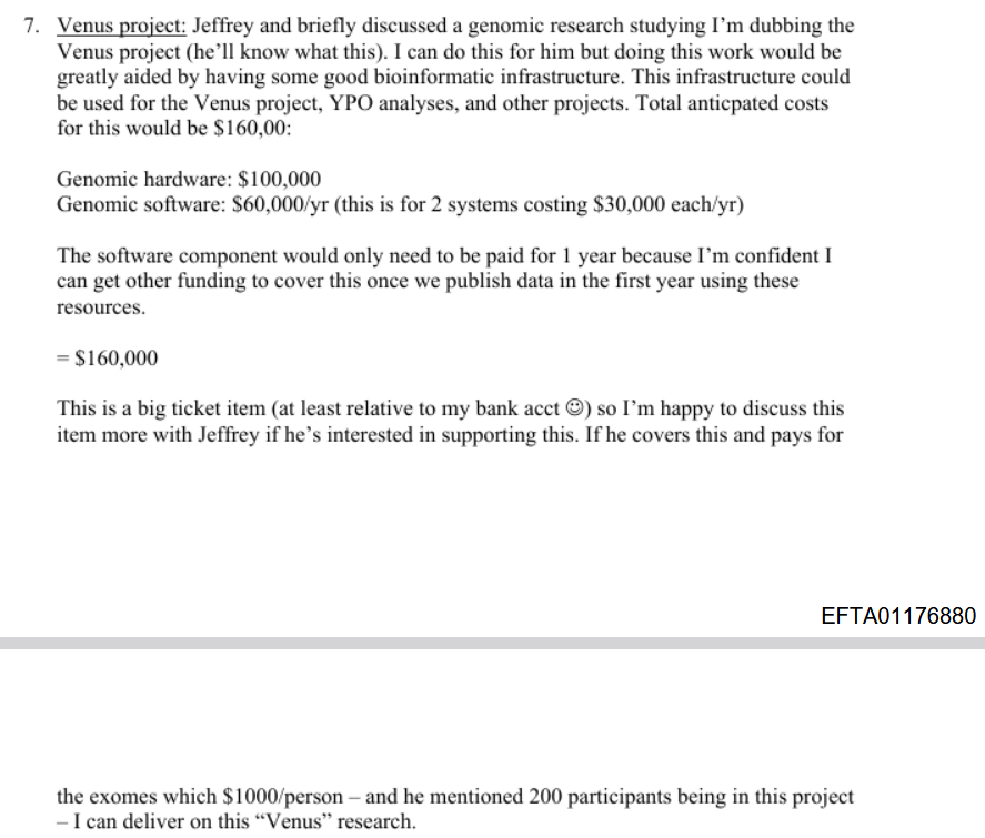 This potential Venus project was apparently related to the genetics of facial features and the possible cost was $160,000.”