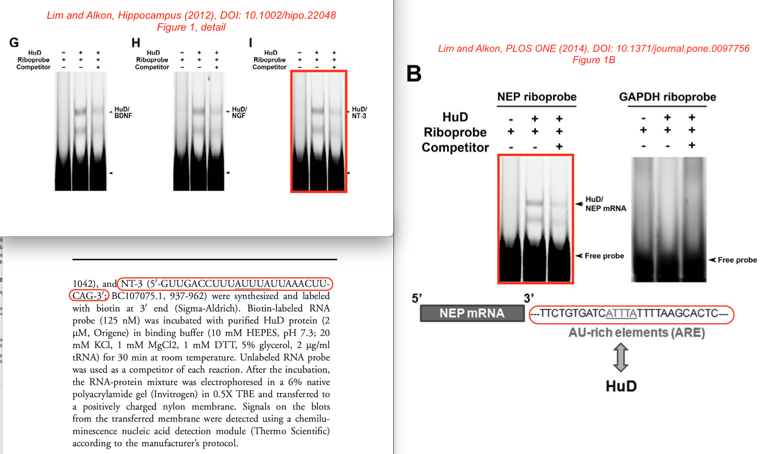 Red boxes: The NEP riboprobe panel appears to look similar to Figure 1I in an older paper by the same authors, i.e. Lim and Alkon, Hippocampus (2012), DOI: 10.1002/hipo.22048, which represents the HuD incubated NT-3 probe.