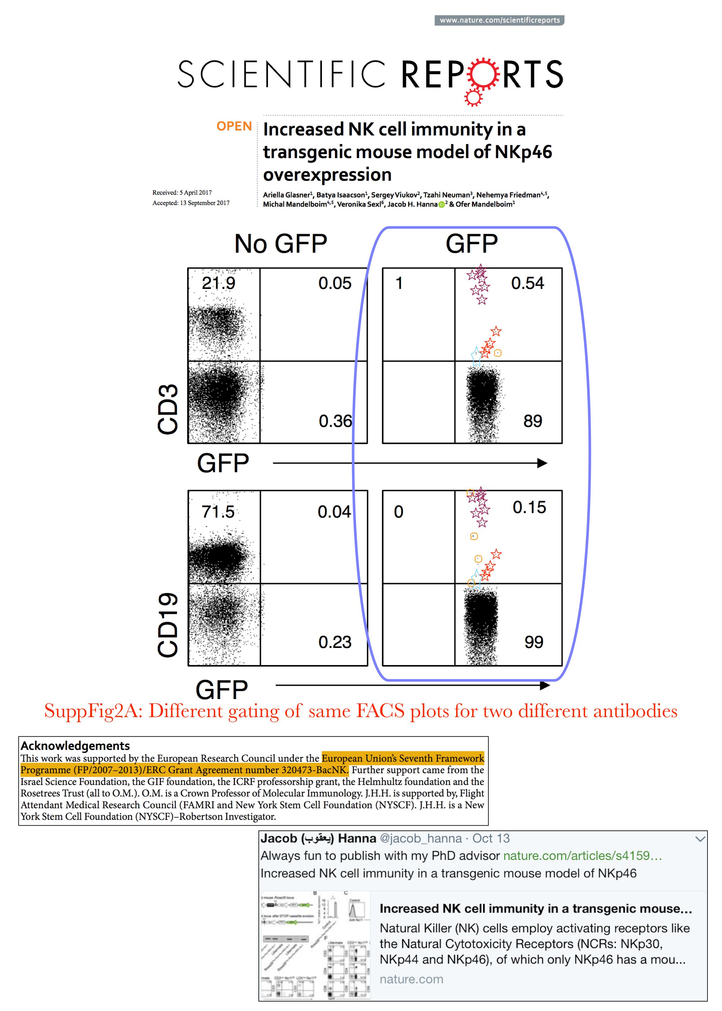 This paper was flagged on PubPeer in October 2017, literally days after it was published, and yet nobody did anything. Hanna’s coauthors are his former PhD mentor at Hebrew University, Ofer Mandelboim, and the Austrian university rector Veronika Sexl (read about her in April 2024 Shorts):