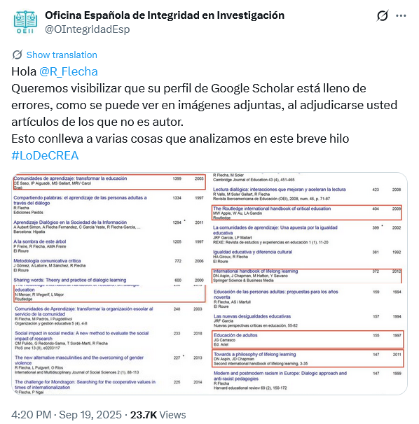 In September 2025, El Diario reported that Flecha “eliminated 7,170 “irregular” citations from his CV after […] the Higher Council for Scientific Research (CSIC) was preparing to expel him from its annual classification of Spanish scientists.” In July 2025, same newspaper reported that the sexual harasser Flecha stole a manuscript on the topic of sexual harassment from a female subordinate and published it as his own, in a journal titled Violence Against Women. Here it is:
