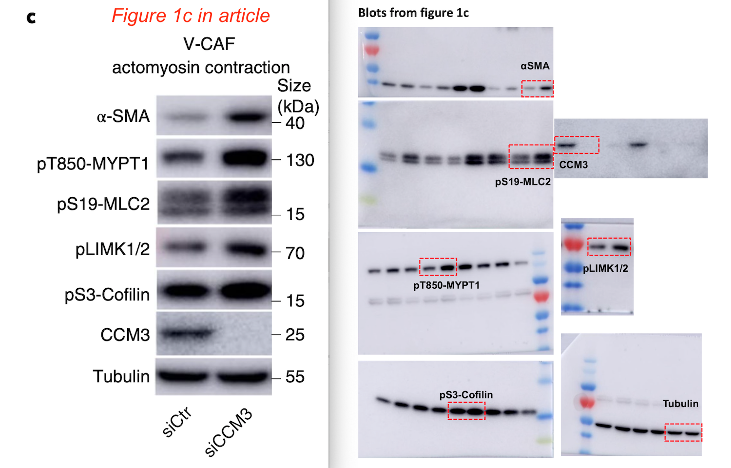 The relative position of the lanes chosen for the main article switch. In particular, alpha-SMA, lanes 9/10; pT850-MYPT1,lanes 4/5; pS19-MLC2,lanes 7/8, pLIMK1/2, lanes 1/2; pS3-Cofilin, lanes 5/6; CCM3, lanes 1-2? (not clear), Tubulin, lanes 5/6.”