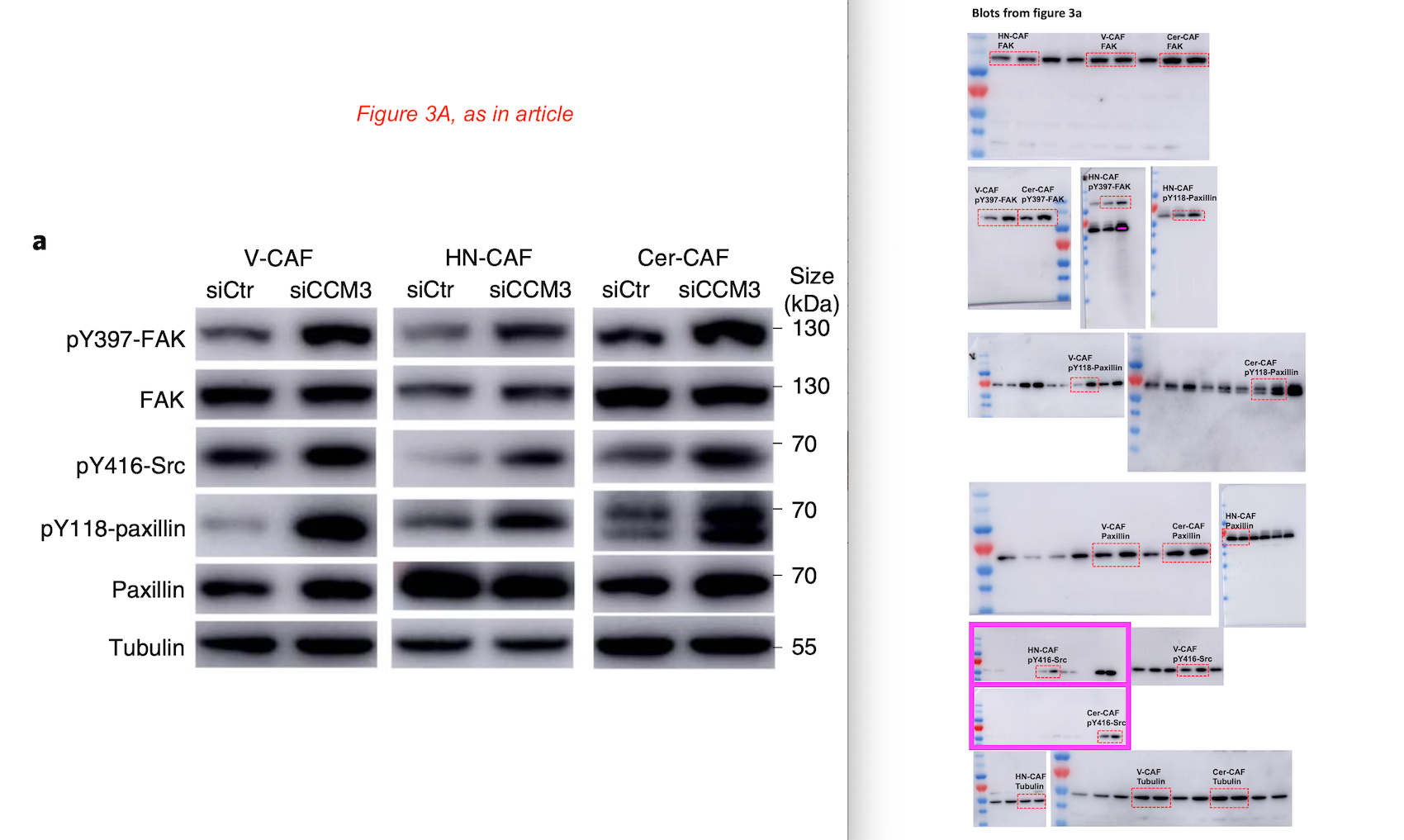 The HN-CAF/pY416-Src and Cer-CAF/pY416-Src blots might be different exposures of the same blot. Shown with pink boxes.”