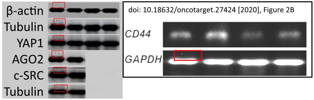 Elisabeth Bik spotted some of the issues in this paper as far back as 2019, around the same time an anonymous account (Lottia cassis) also tagged another Oncotarget paper, including duplicate blots between papers. As is so often the case, opportunities to stop this mischief have been squandered… While there is certainly a huge amount of repurposing and republishing of western blot fragments, some of these papers also include fanciful cut and paste constructions of individual bands. Here is something about a resveratrol analogue from blueberries, apparently it cures cancer: