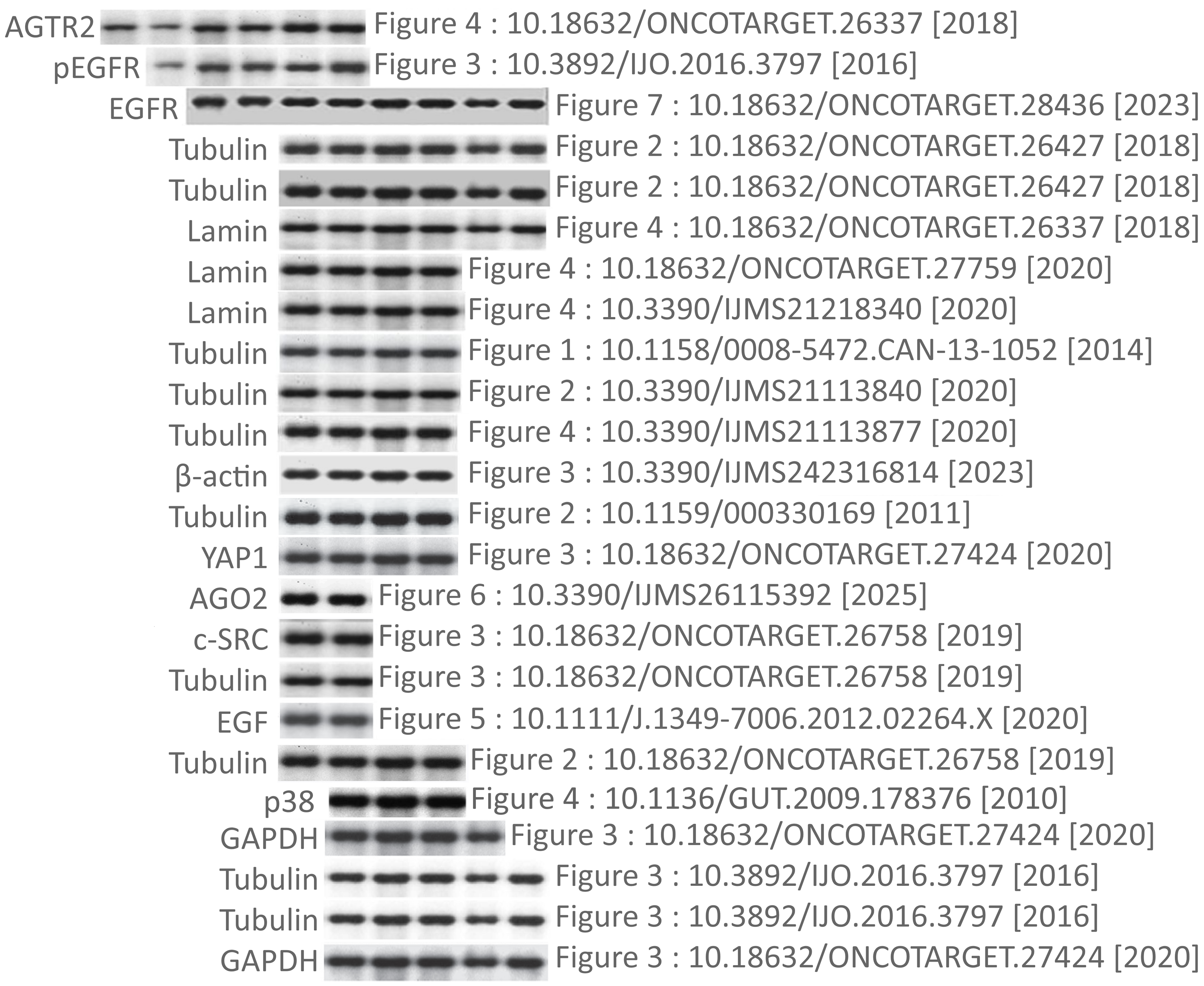 This is another case of image fraud, and it’s a big one, I count 78 papers with troubling duplicated images, most can be easily accessed through a PubPeer name search. Normally I would write about such papers one by one, but it would be so tedious here. Instead I’ll start with a collage showing variations of the same western blot described as representing at least twelve different proteins in 16 papers. So far I have spotted it 24 times… I am quite sure there are more examples.