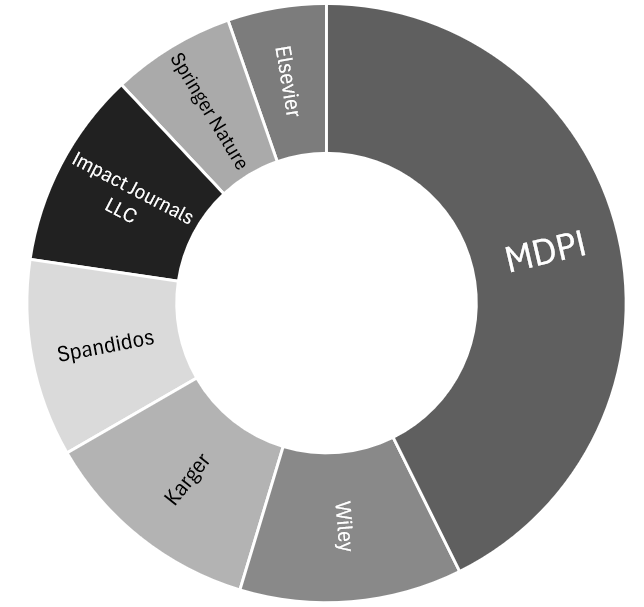 If it wasn’t obvious from the examples I’ve shown so far, the usual suspects from the publishing industry are indeed involved, with around 40% of the problematic papers arriving in MDPI, Karger makes a surprise appearance here. Also prominent: Spandidos and Impact Journals LLC (in the form of Oncotarget).