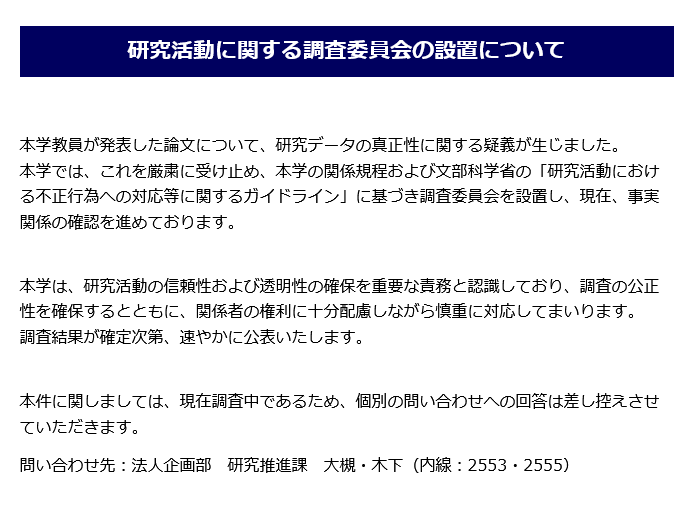 In accordance with our institutional regulations and the MEXT “Guidelines for Responding to Misconduct in Research Activities,” the University has initiated an internal investigation, and a formal investigation committee has been established to review the matter.