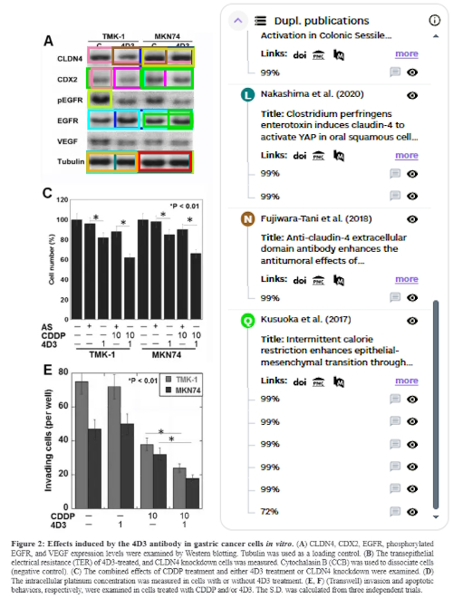 The repurposing of western blots and DNA gels in Hiroki Kuniyasu’s papers is so severe that completely annotating this on PubPeer will be nearly impossible. Here’s a screenshot from a scan of another Oncotarget paper where ImageTwin.ai listed papers containing the same images, annotating them up to the letter “Q”… Meaning, this single Oncotarget paper shares images with sixteen other papers by the same team!