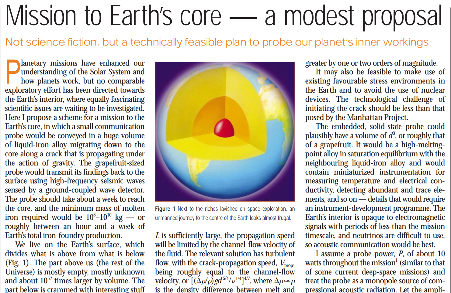But not everyone was satisfied by the solutions that Professors Preuss and Rosa offered for the challenge of keeping space open within (respectively) a piloted vehicle and an Alkahest-drilled tunnel, against the gratuitous pressures one must expect with umpteen thousand kilometers of rock overhead. In particular, David J. Stevenson worked through the trivial details and determined that the probe should be solid; constructed from refractory alloys; and about the size of a grapefruit. That way, if one dumped a whopping great 104 m3 depth-charge of molten iron into a hole in the ground so that it sluiced rapidly Core-wards along a self-propagating fissure cracked open by its own weight, it would wash the probe along in the slipstream. The energy required for the initial hole in the ground (as Stevenson calculated) “is equivalent to … a nuclear device with a capability that is within the range of those currently stockpiled“. Transmitting the observations from the on-board instruments back up to Ground Control will be all fugitive telemetry but hey, we’re still getting signals from Voyager.