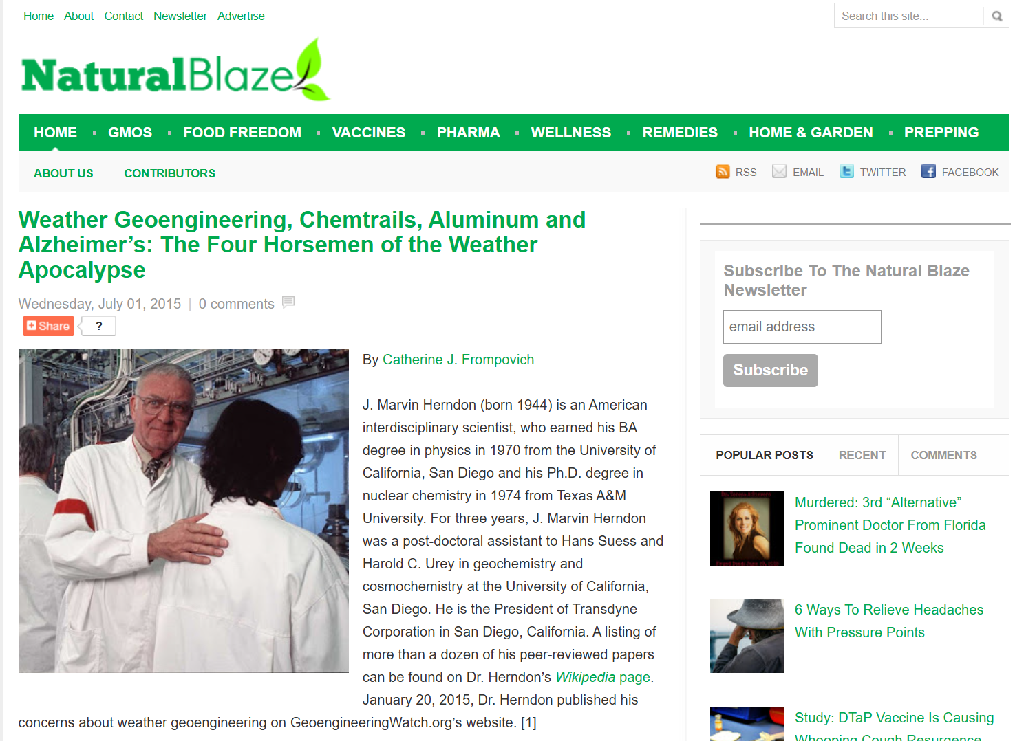 From a 2015 interview with Herndon, introduced by the antivaxxer Catherine Frompovich as former “post-doctoral assistant to Hans Suess and Harold C. Urey” and current President of Transdyne Corporation in San Diego, with the perfectly sane title “Weather Geoengineering, Chemtrails, Aluminum and Alzheimer’s: The Four Horsemen of the Weather Apocalypse“: